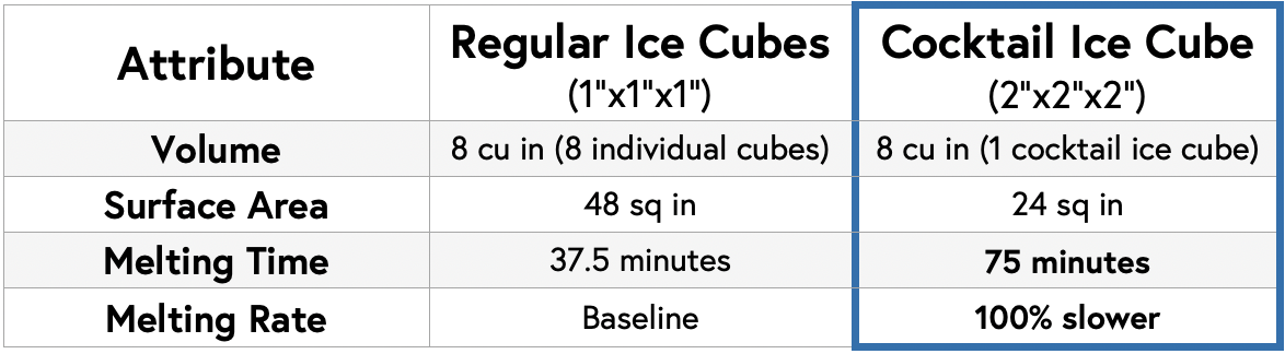 In this example, the cocktail ice is melting 100% slower than regular ice cubes, meaning, for one thing, a far less watered down drink for the consumer and either a faster turnover (FOH managers rejoice!) or, like we also mentioned previously, another drink ordered more quickly.